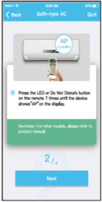 Togliere l’alimentazione elettrica al condizionatore d’aria. Ricollegare l’alimentazione e premere ripetutamente il pulsante LED o il pulsante NON DISTURBARE per 7 volte entro 10 secondi. Quando il display del condizionatore d’aria visualizza AP, significa che il Wi-Fi del condizionatore d’aria è entrata in modalità di impostazione Wi-Fi.